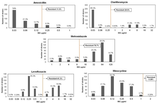 - Murakami, K.; Sato, R.; Okimoto, T.; Watanabe, K.; Nasu, M.; Fujioka, T.; Kodama, M.; Abe, T.; Sato, S.; Arita, T. Effectiveness of minocycline-based triple therapy for eradication of Helicobacter pylori infection. J. Gastroenterol. Hepatol. 2006, 21 Pt 2, 262–267. [Google Scholar] [CrossRef]