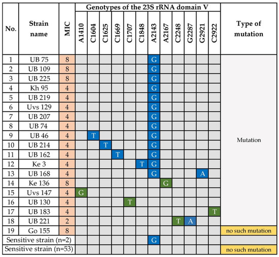 We investigated the mutations in the 23S rRNA gene, particularly in domain V, of 19 clarithromycin-resistant and 55 sensitive strains. Point mutations in the peptidyl transferase region of domain V of 23S rRNA are associated with clarithromycin resistance [10]. Twelve types of point mutations were detected among the 19 clarithromycin-resistant strains. The known mutation, A2143G, was detected in 13 (68.4%) resistant strains and was significantly related to clarithromycin resistance (p = 1.99 × 10−11). Five clarithromycin-resistant isolates had the double mutations A2143G + C1604T, A2143G + C1625T, A2143G + C1669T, A2143G + C1848T, and A2143G + G2921A, which all contained A2143G (Figure 3). However, these additional mutations were not associated with increased MICs compared with the single mutation in A2143G, suggesting it had a minor or no effect on resistance. However, we were surprised to detect the mutation A2143G in two clarithromycin-sensitive strains. Moreover, other nucleotide substitutions in the 23S rRNA gene at A1410G (strain Uvs 147), C1707T (strain UB 130), A2167G (strain Ke 136), and C2922T (strain UB 183), were only detected in clarithromycin-resistant strains. Strain UB 221 carried the double point mutations C2248T + G2287A. Interestingly, the highly resistant strain Go 155 did not carry a mutation in the 23S rRNA domain V. Furthermore, most clarithromycin-sensitive strains (53/55, 96.4%) lacked mutations in domain V.