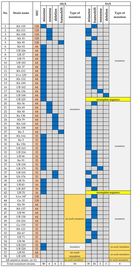 Mutations in rdxA, which encode oxygen insensitive NADPH nitroreductase, and inactivation of frxA, which encodes NADPH flavin oxidoreductase, are associated with resistance to metronidazole [16,17]. Fifty-eight (78.4%) strains were resistant to metronidazole (Figure 4), and among the resistant strains, 30/58 (51.7%) carried missense mutations and 6/58 (10.3%) carried a nonsense mutation in rdxA (Figure 4). Six strains (10.3%) had the deletion, and two strains (3.4%) carried a frameshift mutation in rdxA. Twenty-five strains carried missense mutations in frxA, and the frameshift mutation was predominantly detected in frxA (24/58) compared with rdxA. Two strains carried a nonsense mutation, and frxA was deleted from one strain. The sequences of two strains were incomplete. Interestingly, the two strains that were moderately resistant to metronidazole (MIC 32–64 μg/mL) did not carry mutations in rdxA or frxA.