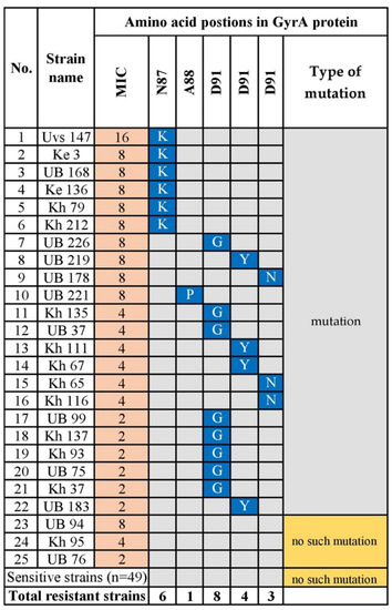 - Miyachi, H.; Miki, I.; Aoyama, N.; Shirasaka, D.; Matsumoto, Y.; Toyoda, M.; Mitani, T.; Morita, Y.; Tamura, T.; Kinoshita, S.; et al. Primary levofloxacin resistance and gyrA/B mutations among Helicobacter pylori in Japan. Helicobacter 2006, 11, 243–249. [Google Scholar] [CrossRef] [PubMed]