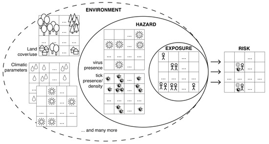 Assessing the spatial risk for human tick-borne encephalitis results from a combination of hazard (virus presence and tick presence/density) and exposure (e.g., human outdoor activity, vaccination rate) triggered by abiotic and biotic environment.