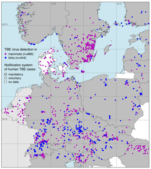 Georeferenced tick-borne encephalitis (TBE) virus detections in ticks (blue), mainly the castor bean tick Ixodes ricinus, and endothermic mammals except for humans (purple). Additionally, the sort of national notification system for human TBE cases is given.