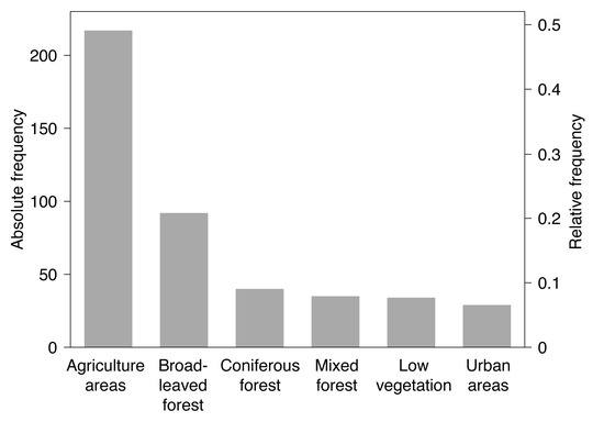Georeferenced detections of TBE virus-infected ticks were mostly Ixodes ricinus (, 78.8%). Virus detections in endothermic mammals include wild mammals such as rodents, deer, or wild boars (, 41.8%) as well as domestic animals such as dogs, horses, or cattle (, 58.2%). Please note that at some locations TBE virus was detected in more than one species. By using a spatial thinning algorithm, the dataset was optimized to address the known problems with spatial sampling biases, e.g., due to clustered data [34]. With an appropriate distance of 20 km the dataset was reduced to 447 (35.5%) of previously 1333 locations where TBE virus was detected. As depicted in Figure 3, the majority of the selected locations lay in the land cover class agriculture areas (, 48.5%), followed by broad-leaved forest (, 20.6%) and coniferous forest (, 8.9%).