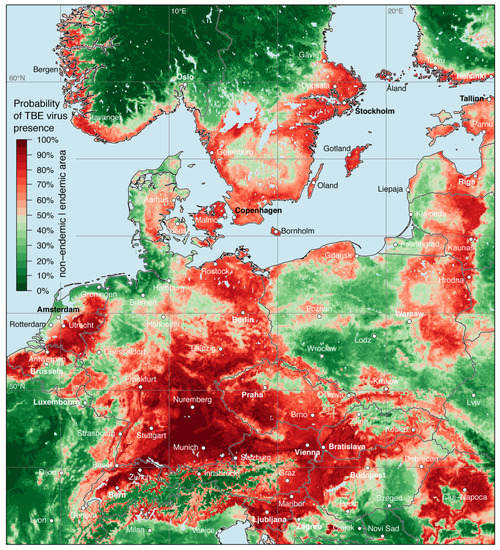 Species distribution models represent an alternative approach for predicting the potential geographical distribution of infectious diseases by means of georeferenced pathogen and/or disease detections and associated environmental or disease-influencing variables. Such models treat the entire disease system, i.e., in case of TBE the virus–vector–host interaction, as a so-called black box. As an advantage of this approach, SDMs are relatively easy and cost-effective to implement and deliver results quickly [13]. One limitation is that a lack of data on TBE virus detections in some regions can lead to false negative results (i.e., low probability of virus presence vs. on-going TBE virus circulation) [13].