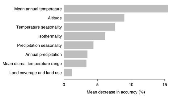 Random forests models provide a ranking of the most important environmental variables for model fitting and prediction by means of decrease in accuracy. High values of mean decrease in accuracy indicate variables that are important for model performance [35]. As shown in Figure 5, mean annual temperature, altitude, and temperature seasonality were most important to predict the probability of TBE virus presence. Removing the mean annual temperature from the set of possible environmental predictors would result in a mean decrease in model accuracy of 15.5%, for altitude of 9.0%, and temperature seasonality of 7.6%.