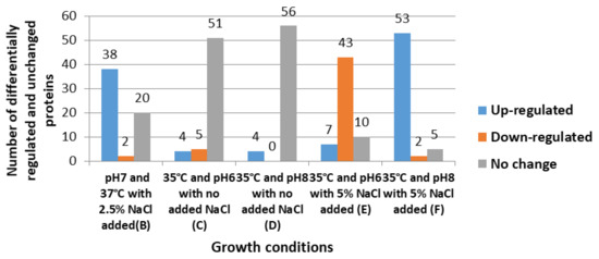 The number of proteins differentially regulated in each experimental group varied according to the growth conditions applied (Figure 1). For example, the cells exposed to pH 8 at 35 °C with an additional 5% NaCl (F) yielded the greatest number of altered proteins (55), including 53 up regulated proteins and two down regulated proteins, whilst the expression of five proteins remained unchanged (Figure 1). The equivalent cultures grown at pH 6 and 35 °C with 5% NaCl (E) showed that the regulation of 50 proteins was altered, including 43 down regulated and seven up regulated, while the expression of 10 proteins remained unchanged. Compared with the reference controls (A), the cells grown at pH 7 and 37 °C with 2.5% NaCl (B) showed 38 up regulated and two down regulated proteins, and the expression of 20 proteins did not change. However, the bacterial cells grown in cultures without NaCl showed few changes in cytoplasmic compositions; the cells exposed to pH 6 and 35 °C (C) had four proteins up regulated and five down regulated, whereas those exposed to pH 8 and 35 °C (D) had only four proteins up regulated and none down regulated.