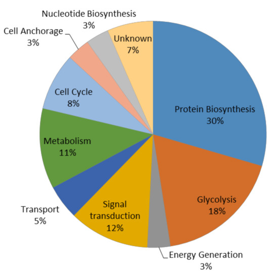 Gene ontology functional enrichment analysis by the PANTHER classification system was applied to determine the putative function of 60 proteins that showed significant differences in their abundances (Figure 3). These proteins were classified into 10 functional categories: protein biosynthesis (30%), glycolysis (18%), signal transduction (12%), metabolism (11%), cell cycle (8%), transport (5%), energy generation (3%), cell anchorage (3%), nucleotide biosynthesis (3%), and unknown (7%).