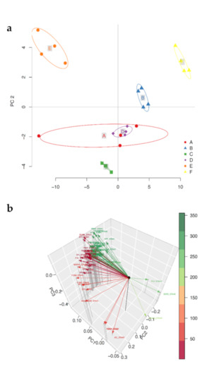 (a) PCA analysis of the differentially regulated proteins’ (A) control cultures grown under ideal conditions at pH 7 and 37 °C with no added NaCl; (B) the centroid cultures grown at pH 7 and 37 °C with additional 2.5% NaCl, and the four experimental groups: (C) 35 °C and pH 6 with no added NaCl; (D) 35 °C and pH 8 with no added NaCl; (E) 35 °C and pH 6 with 5% NaCl added; (F) 35 °C and pH 8 with 5% NaCl. (b) The loadings PC1, PC2, and PC3 demonstrated the contributions of the proteins to the model.