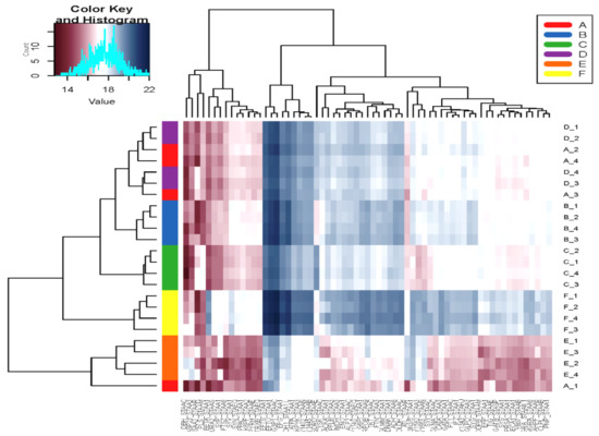 The pattern of the global proteins was investigated using hierarchical clustering and a correlation heatmap (Figure 5), which the visualized the protein abundance for all the experimental groups. The bacterial cells grown at 5% NaCl (E and F) showed a very different cluster from those grown under ideal conditions (A). However, the experimental groups (C and D) cultured without NaCl had a pattern more similar to that of the reference control (A) and centroid (B) (Figure 4).