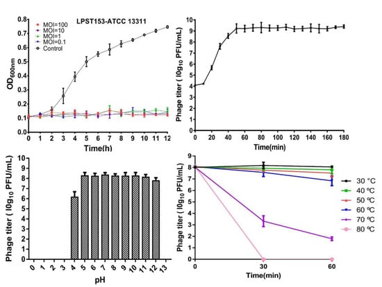 The lytic activity of phage LPST153 was investigated by infecting S. Typhimurium ATCC 13311 in liquid cultures (Figure 2A). As shown in Figure 2A, phage LPST153 could constantly inhibit the growth of S. Typhimurium ATCC 13311 with less counts at MOI ratios of 0.1, 1, 10 and 100 in 12 h (p < 0.05). The one-step growth curve of LPST153 was showed in Figure 2B. The latent period of LPST153 was observed within 10 min and the burst size was approximately 113 ± 8 PFU/cell. For confirming application of LPST153 as a biocontrol agent to inhibit pathogenic bacteria, its viable stability would be needed to be confirmed under various stress conditions, such as pH and temperature. The pH stability test of the LPST153 showed that it was highly stable with environmental pH flowing from 4 to 12. However, this phage was completely abolished under strong acid or strong alkali (pH < 4 or pH > 12) (Figure 2C). There was no significant loss of LPST153 phage count between 30 °C and 60 °C, while it is the optimum temperature for phage stability from 30 °C to 50 °C. However, the phage count was reduced by approximately 75% at 70 °C, indicating that phage LPST153 has moderate heat resistance (Figure 2D).