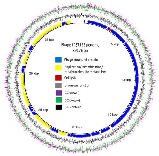 The following are available online at https://www.mdpi.com/2076-2607/8/7/1089/s1. Table S1. Functional annotation of LPST153 CDSs. Table S2. Comparison of phages against the LPST153 genome.