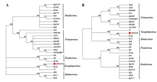 When the genome sequence was compared in NCBI database by BlastN analysis, the results showed the genome of phage LPST153 has a high degree of homology with phage BP12A in the database (Genbank Acc. No. KM366096). Phage BP12A is an unknown characteristics phage (there is no related published article yet) and also whether phage has the ability to degrade exopolysaccharides. Other phages offered the average similarity with LPST153 below 90% (Table S2). The phylogenetic trees obtained using terminase large subunit, and major capsid proteins (Figure 4A,B) exhibited similar topologies and supported assignment of phage LPST153 to a sublineage shared by Kluyvera phage Kvp1 and Escherichia Phage T7, which are the recommended phages of Teseptimavirus genus. Phylogenetic analysis showed that LPST153 had high identities with Teseptimavirus phage but separated from Drulisvirus, Friunavirus, Pradovirus and Zindervirus (Figure 4). The genome analysis and phylogenetic results indicated that LPST153 is the new member of the Teseptimavirus genus of Autographivirinae subfamily (Figure 4 and Table S2).
