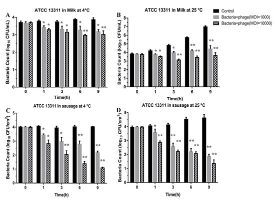 Effectiveness of phage LPST153 in reducing S. Typhimurium ATCC 13311 in food matrices. Effect of phage LPST153 on growth of S. Typhimurium ATCC 13311 in the milk incubated at (A) 4 °C and (B) 25 °C and in sausage incubated at (C) 4 °C and (D) 25 °C. Values represent mean with standard deviation of three determinations. ** Significant at p < 0.01; * Significant at p < 0.05.