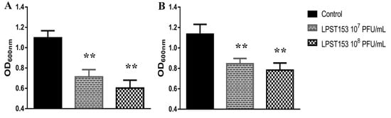 Effect of phage LPST153 on biofilm. (A) Effect of phage LPST153 on inhibition of biofilm in 96-well microplate at 30 °C after 72-h incubation, and (B) Effect of phage LPST153 on 72-h-old biofilm in 96-well microplate at 30 °C after 12 h postinfection. Values represent mean with standard deviation of six determinations. ** Significant at p < 0.01.