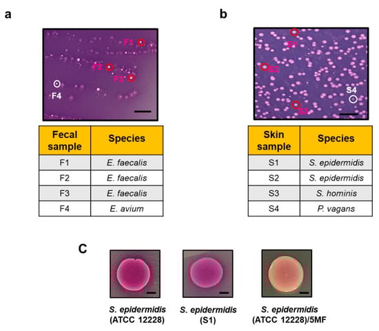 When the exposure of FAC to the electron produced by bacteria caused the reduction of Fe3+ to Fe2+, that bound to ferrozine and formed dark purple complexes abilities [7,14]. We mixed FAC (Fe3+) with TSB media, agarose, and ferrozine to create solid agar plates. To screen the electrogenic bacteria, the plates supplemented with 2% glucose or glycerol, respectively, were overlaid with samples collected from human fecal and skin. Previous studies have verified glucose and glycerol as electron donors for electricity production [15]. As shown in Figure 1a,b, several bacterial colonies formed the dark purple (ferrozine-Fe2+) complexes after 24 h incubation. Three dark purple colonies and one light purple colony from both fecal and skin samples were randomly selected and labeled as F1-4 and S1-4, respectively. F1, F2, and F3 colonies with dark purple complexes in fecal samples were identified as E. faecalis by 16S rRNA sequencing (Supplementary Table S1). The 16S rRNA sequence of the F4 colony with light purple color matched with that of Enterococcus avium (E. avium). The 16S rRNA of S1 and S2 colonies with dark purple complexes in skin samples were sequenced as S. epidermidis. The S3 colony with a dark purple complex was verified as Staphylococcus hominis (S. hominis) and the S4 colony with light purple color was confirmed as Pantoea vagans (P. vagans) (Supplementary Table S2).