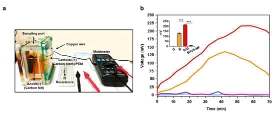 Electricity Production of S. epidermidis in MFCs. (a) A representative image of S. epidermidis ATCC 12228 plus 2% glycerol in MFC equipped with carbon felt as an anode, carbon cloth/PEM as a cathode, 1000 Ω resistance, sample port, copper wire, and a multimeter. (b) Electricity measured by voltage changes (mV) in MFC was recorded for 70 min in media containing glycerol (G), bacteria (B), bacteria plus glycerol (B/G), or 5-MF-pretreated bacteria plus glycerol (B/G/5-MF). The inset panel represented the peak voltage of each group. Data are the mean ± SD from three separate experiments. *** p < 0.001 (two-tailed t-tests).