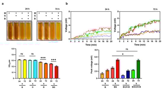 The effect of UV-B on electricity generation from a 24 or 72 h period of S. epidermidis fermentation. (a) Media (M) alone or with 107 CFU/mL bacteria (B) in the presence or absence of 2% glycerol (G) were incubated for 24 or 72 h. The color change of phenol red in media from red to yellow indicated the phenomenon of fermentation which was quantified by OD562. (b) Electricity measured by voltage changes (mV) in an in vitro chamber was recorded for 20 min upon a UV-B dosage of 1 mJ/cm2. The peak voltage of each group was quantified. Results are the mean ± SD from three independent experiments. ns = non-significant. * p < 0.05; *** p < 0.001 (two-tailed t-tests).