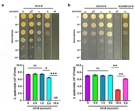 Enhancement of Bacterial Resistance to UV-B by Glycerol Fermentation. The photographic images of (a) 107 CFU S. epidermidis (B) in the absence (a) or presence (b) of 2% glycerol (G) was irradiated by different UV-B dosages of 0, 0.5, 1, 5, and 10 mJ/cm2. 5-MF-pretreated S. epidermidis (107 CFU) in the presence of 2% glycerol (5-MF/B/G/UV-B) was irradiated by 5 mJ/cm2. CFUs of bacteria with/without UV-B irradiation were counted after dropping the serially diluted (1:100–1:105) bacteria onto TSB agar plates and illustrated by the mean ± SD, in triplicate. ns = non-significant. * p < 0.05; ** p < 0.01 *** p < 0.001 (two-tailed t-tests).