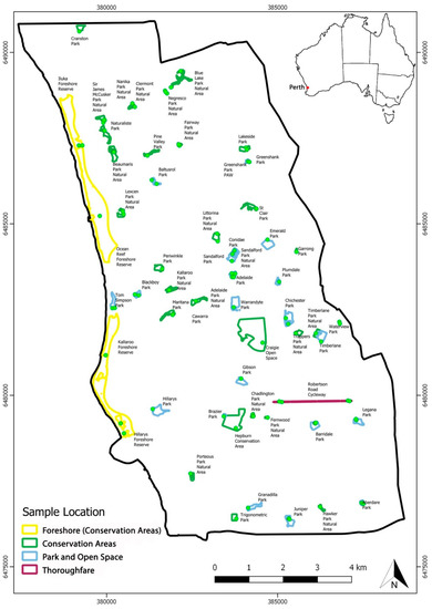 The area investigated was the City of Joondalup, located approximately 26 km north of Perth, WA, covering an area of 98.9 km2 (Figure 1) and several different soil complexes. The Spearwood soil is a siliceous yellow sand, weakly acidic with some iron oxide (0% CaCO3 to 120 cm depth) [25], the Quindalup soil is a calcareous whitish beach sand (8–36% CaCO3), while the Karrakatta soil derived from calcareous beach sand (50–70% CaCO3) leached to form secondary calcite layers at depth [26].