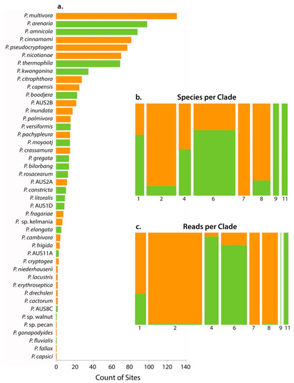 Fifty-five percent of the species found were putatively designated as introduced, while the remainder were designated as putatively native (Table 2, Figure 2). There was unequal phylotype distribution across the Phytophthora clades; one third belonged to clade 6, while only two phylotypes were identified from clades 9 and 11 (Table 2, Figure 2b). Species in clades 6, 9 and 11 were predominately considered native, while most of those in clades 2, 7 and 8 were considered introduced (Table 2, Figure 2b). While there were more species detected from clade 6, most of the reads were from clade 2 (Table 2, Figure 2b,c). Two species were detected from clade 9, but they accounted for very few reads (Table 2, Figure 2b,c).