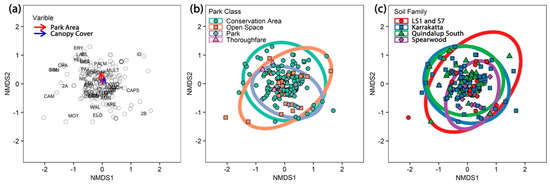 (a) Non-metric multidimensional scaling (NMDS) plot showing the significant continuous variables park area and canopy cover. Phytophthora species codes and site (hollow points) are displayed on the plot. The arrow length is proportional to the degree of correlations between the variable and the ordination. The arrows are very short indicating minimal correlation. (b,c) NMDS plots of Phytophthora communities showing the complete overlap of ellipses for (b) park class, and (c) soil family.
