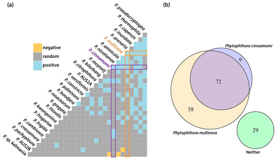 (a) Pairwise co-occurrence matrix for a subset of Phytophthora species that exceeded a minimum threshold of expected co-occurrence (>1 site). Orange and blue tiles correspond to species pairs that were less or more likey to co-occur than predicted by a null model. (b) Venn diagram of detections from 168 sampling sites showing the relationship between the two main invasive species, Phytophthora cinnamomi and P. multivora.