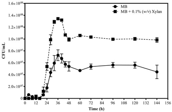 R. sacchariphilus strain RA was cultured for six days, in either MB or MB+xylan. Figure 1 shows the growth profiles. The patterns for growth on each medium are quite similar, with a lag phase of approximately 24 h, followed by an exponential phase (24–36 h), and eventually CFU decline after that (36–48 h) before plateauing. When cultivating in MB and supplemented MB media, strain RA achieved maximum growth after 36 h, and the cell concentration was almost double in MB+xylan (approximately 1.34 × 108 CFU/mL) compared to growth in MB (approximately 7.3 × 107 CFU/mL). At the exponential phase, the growth rate and doubling time (Td) cultivated on MB+xylan were 0.28 h−1 and 106 min, respectively, whereas they were 0.25 h−1 (growth rate) and 122 min (Td) for the bacteria grown on MB. The enzymatic hydrolysis of xylan yielded xylose and xylooligosaccharides; these additional carbon sources affected the growth of strain RA. Collectively, the data showed that strain RA could grow better when xylan was available.