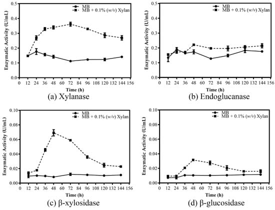 Enzyme activities (xylanase, endoglucanase, β-xylosidase, and β-glucosidase) of strain RA growing in MB and MB+xylan were determined (Figure 2). Endoglucanase and xylanase are primary enzymes for hydrolyzing cellulose and xylan in hemicellulose, respectively. β-xylosidase and β-glucosidase are pivotal enzymes in the saccharification process in forming monomeric sugars. Detected enzyme activities were low throughout the six days (144 h) if cells were cultivated in MB alone. Xylanase is induced to a maximum of 3-fold at 72 h but then declines to a small extent thereafter (Figure 2a). β-xylosidase and β-glucosidase are induced 8-fold and 3-fold, respectively, at 48 h, but both then decrease significantly after that (Figure 2c,d). In contrast, endoglucanase activity is induced to a much less significant extent and shows no corresponding decline to that recorded for the other three enzymes (Figure 2b).