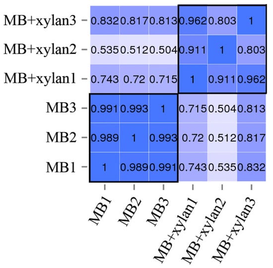 The correlation (R2 value) between the samples. 1, 2, and 3 represent the three biological replicates of each experiment. MB: R. sacchariphilus strain RA culturing on MB medium. MB+xylan: Bacteria growth on MB supplemented with beechwood xylan (0.1% w/v).