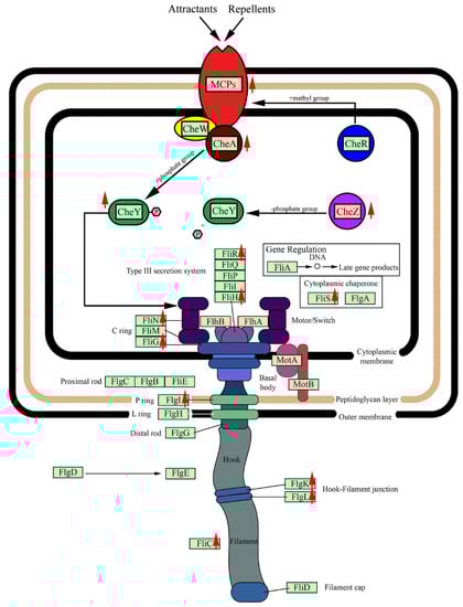 Schematic diagram for chemotaxis pathway and flagella assembly in strain RA. The red arrows indicate the upregulated genes when strain RA grows on MB supplemented with beechwood xylan.