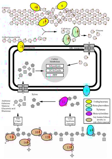 Lignocellulosic biomass consists of lignin, cellulose, and hemicellulose. In nature, microbial consortia rather than a single taxon biodegrade plant biomass [1]. Individual members in the consortia often have specific roles and preferences toward the lignocellulolytic carbohydrates such as cellulose and xylan [2]. Asticcaculis, Cellulomonas, and Chryseobacterium are good cellulose degraders; however, they are ineffective at degrading hemicellulose [2]. Caulobacter, Sphingobacterium, and Sphingobium hydrolyze hemicellulose but are inefficient at hydrolyzing cellulose [2]. Not many bacteria produce ligninolytic enzymes; examples of bacteria with that ability are Pseudomonas and Sinorhizobium [3,4]. Lignocellulolytic microorganisms have been isolated from a diverse range of isolated environments, including soils, compost, aquatic habitats, digestive tracts of herbivores, termite guts, landfill, and waste digesters [1]. Among the many, Caldicellulosiruptor, Rhodothermus, and Pseudoxanthomonas are effective degraders of cellulose and hemicellulose [5,6,7].