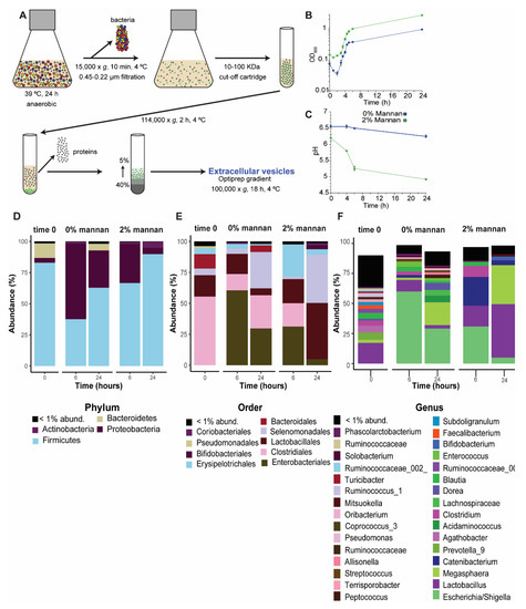 Methodology to isolate extracellular vesicles, EVs, and characterization of the bacterial community. Diagram showing the methodology used to isolate EVs in vitro, based on sequential centrifugation and density gradient separation (A). Growth curve of fecal inoculum cultivated in vitro in the presence of β-mannan or without any carbohydrate (control) (B). pH measurement of in vitro cultures either with or without the presence of β-mannan (C). Microbial diversity and composition in the cultures containing either 2% β-mannan or no carbohydrate addition. Samples were collected at 0, 6, and 24 h and subjected to amplicon sequencing of the 16S rRNA gene. The relative abundances of the dominant phyla (D), orders (E), and genera (F) that resulted from in vitro cultivation in the absence (0% mannan) or presence (2% mannan) of β-mannan are shown as stacked bar plots. The black bars in D–F indicate the summed abundance of different phyla, orders, or genera that were individually present at less than 1% abundance.