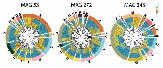 Classification of the identified proteins present in EVs into Clusters of Orthologous Groups (COG) of proteins revealed that the most abundant proteins belonged to MAGs 53, 272, and 343, and are involved in translation, ribosomal structure, RNA metabolic processes, and nucleotide-binding (Figure 3). Interestingly, Zhang et al. [40] showed an association between microbiome and intestinal EVs in pediatric inflammatory bowel disease, where the proteins found in EVs isolated from microbiota were related to DNA replication, recombination, and repair. In addition, S. Liu et al. [41] found that miRNAs were present in EVs isolated from feces and that they directly regulated specific bacterial expression affecting microbial growth.