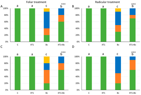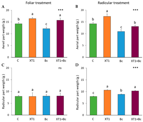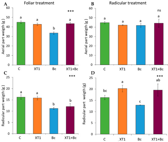 Effect of XT1 foliar (A,C) and radicular (B,D) applications on tomato plants. C: non-inoculated control plants; XT1: XT1-treated plants; Bc: B. cinerea-infected non-treated plants; XT1+Bc: XT1-treated B. cinerea-infected plants. Letters above the main bars represent statistical differences according to the Fisher test *** (p ≤ 0.001), ns (no significance). Significant differences between treatments are indicated by different letters (a,b,c).