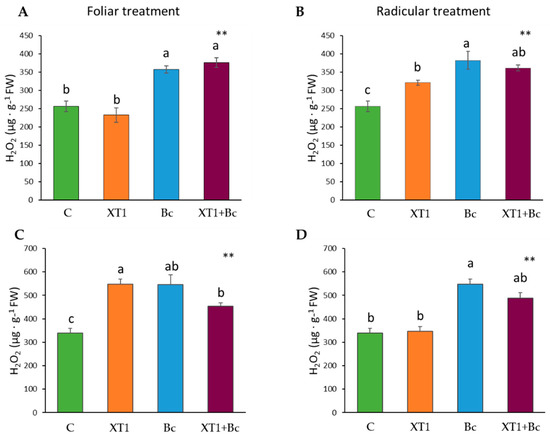 H2O2 content in tomato (A,B) and strawberry (C,D) plants after foliar and radicular XT1 treatment. C: non-inoculated control plants; XT1: XT1-treated plants; Bc: B. cinerea-infected non-treated plants; XT1+Bc: XT1-treated B. cinerea-infected plants. Letters above the main bars represent statistical differences according to the Fisher test ** (p ≤ 0.01). Significant differences between treatments are indicated by different letters (a,b,c).
