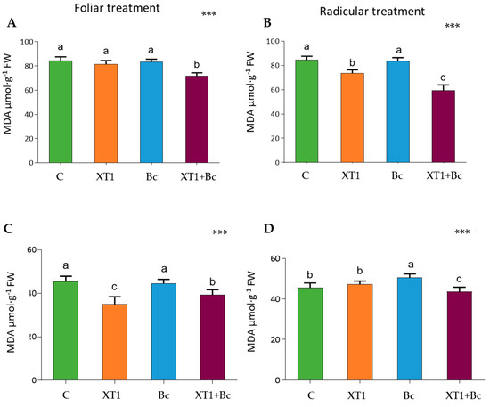 Malondialdehyde (MDA) content in tomato (A,B) and strawberry (C,D) plants after foliar and radicular XT1 treatments. C: non-inoculated control plants; XT1: XT1-treated plants; Bc: B. cinerea-infected non-treated plants; XT1+Bc: XT1-treated B. cinerea-infected plants. Letters above the main bars represent statistical differences according to the Fisher test *** (p ≤ 0.001). Significant differences between treatments are indicated by different letters (a,b,c).
