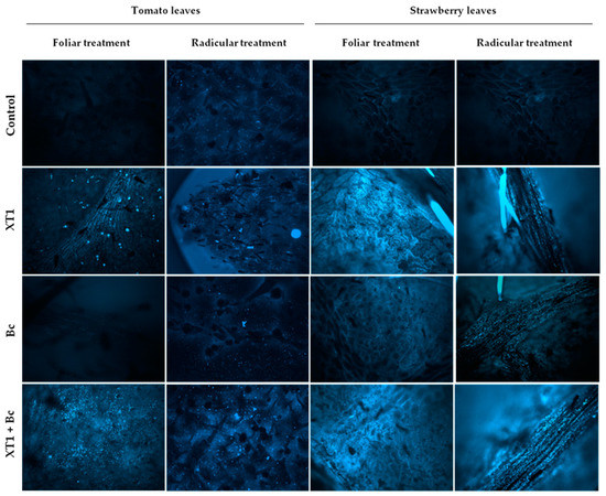 Preventive foliar and radicular applications of strain XT1 in B. cinerea-infected (XT1+Bc) tomato and strawberry plants increased callose deposits considerably in leaves as compared to infected non-treated plants (Bc). This increase was also pronounced in XT1-treated non-B. cinerea-infected plants (XT1) compared to uninoculated plants (C) (Figure 6).