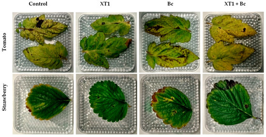 Effect of inoculation with strain XT1 on leaves from B. cinerea-infected strawberry and tomato plants. Leaves from negative control (C), XT1-treated (XT1), B. cinerea-infected non-treated (Bc) and XT1-treated B. cinerea-infected (XT1+Bc) tomato and strawberry plants.