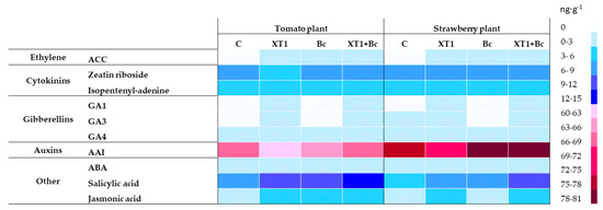 Effect of XT1 inoculation and B. cinerea infection on phytohormone content in tomato and strawberry plants. C: non-inoculated control plants; XT1: XT1-treated plants; Bc: B. cinerea-infected non-treated plants; XT1+Bc: XT1-treated B. cinerea-infected plants.