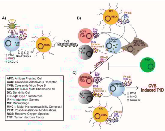 Model of coxsackievirus type B (CVB)-induced type 1 diabetes (T1D). (A) Coxsackievirus binds to the Coxsackievirus and Adenovirus Receptor (CAR) on the β-cell leading to β-cell infection, cellular dysregulation, interferon-alpha and -beta (IFN-α/β) synthesis, and generation of neo-epitopes. Phagocytosis and presentation of neo-epitopes by antigen-presenting cells (APCs) leads to the activation of autoreactive CD4 and CD8 T cells. (B) CVB dissemination leads to the generation and differentiation of CVB-specific CD4 and CD8 T cells. Both CD4 and CD8 T cells will gain effector responses, CD4 T cells will produce ROS and IFN-γ. Whereas, CD8 T cells will produce ROS, perforin, and granzyme B targeting infected β-cells and acinar cells, while APCs will concomitantly produce ROS, IFN-α/β, and TNF to promote viral clearance and immune cell activation. (C) The proinflammatory response to CVB infection and generation of IFN-α/β and IFN-γ leads to the loss of Treg peripheral tolerance. Subsequent activation of proinflammatory APCs and autoreactive CD4 and CD8 T cells further propagate CVB-induced T1D.