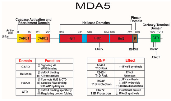 MDA5 was first discovered in 2001 as an IFN-β-inducible protein with dsRNA binding, ATPase activity, and the ability to suppress human melanoma cell growth by regulating interferon-mediated cell growth and apoptosis [193,194]. MDA5 recognizes positive-sense single-stranded non-enveloped RNA viruses, such as enteroviruses and noroviruses, and prevents early replication of CVB infection [163,195,196,197,198,199]. Additional reports showed that MDA5 preferentially binds long dsRNA greater than 1000 bp with no 5′ cap and can induce IFN-α/β synthesis [200,201,202]. Multiple SNPs in IFIH1 have been associated with risk or protection for T1D, potentially due to modification of the structure and function of MDA5 [14].