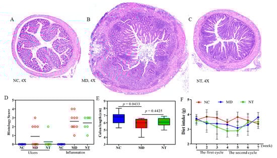 Neoagarotetraose (NT) promoted mucosal healing in dextran sulfate sodium (DSS)-induced murine colitis mice. Hematoxylin and Eosin staining of (A) normal controls (NC), (B) colitis induced by DSS (MD), and (C) colitis mice supplemented with NT. (D) Historical scores of ulceration and the number of inflammatory infiltrates was improved due to NT supplementation. (E) The colon length was significantly reduced by DSS. (F) Daily feed intake during the two DSS cycles.