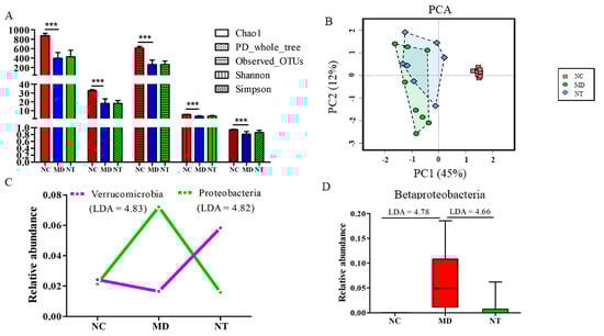 The modulatory effect of neoagarotetraose (NT) on the murine gut microbiome. NC: normal control mice. MD: DSS induced colitis mice. NT: DSS induced colitis mice supplemented with NT. (A) Alpha diversity indices impacted by DSS and NT supplementation. *** p < 0.01 based on Wilcoxon Rank Sum testing. (B) Beta diversity based on Principal component analysis (PCA). (C) The relative abundance of select phyla. Absolute log10 Linear Discriminant Analysis (LDA) scores were obtained using the LEfSE algorithm. (D) The relative abundance of the class β Proteobacteria significantly reduced by NT.