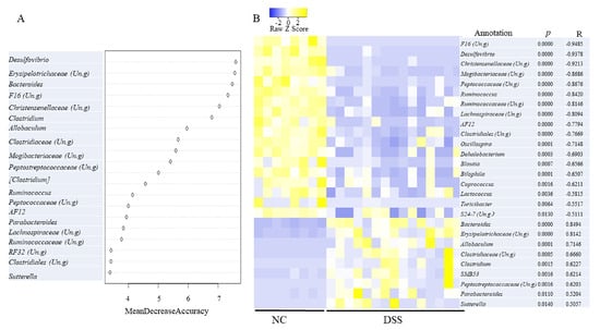 Microbial genera significantly related to DSS induced colitis phenotypes. (A) The Random Forest analysis identified important microbial genera distinguishing colitis phenotypes. Un.g: unclassified genus in a given family. (B) Taxa significantly correlated with the colitis status. P: significance; R: correlation coefficient.