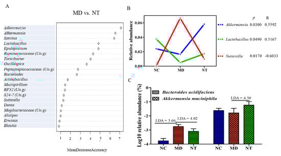 The Random Forest (RF) algorithm, one of popular machine learning tools, was used to estimate the correlation between environmental variables and important microbial taxa. As Figure 3A shows, the top 20 genera provided an excellent accuracy in classifying NC and MD. The genus Desulfovibrio, ranked as the most important feature, based on mean decrease accuracy, was found to be 6.19-fold more abundant in NC than in colitis mice (MD). Moreover, a Pearson correlation analysis between the status of the DSS treatment and the relative abundance of various genera was performed. An unclassified genus in the family F16 and Desulfovibrio had a strong, yet negative, correlation with the DSS status, as shown in Figure 3B (R < −0.93, p < 0.05). An unclassified genus in the families Christensenellaceae was also strongly and negatively correlated with the DSS status (p < 0.0000; R < −0.92). The latter family is implicated in multiple human diseases, including IBD [26]. On the other hand, Bacteroides was positively correlated with DSS treatment (R = 0.8494, p < 0.05) and was 11.32-fold more abundant in DSS treated mice than in the normal controls. This genus was also among the most important variables with respect to classifying the DSS status. The abundance of Sutterella was increased from 0.002 in NC to 6.66% in colitis mice (MD). Furthermore, Sutterella was ranked as the most important genera in contributing to classifying the NT supplementation status, as shown in Figure 4A. Intriguingly, the abundance of Sutterella was significantly decreased by NT ingestion, as shown in Figure 4B (LDA = 4.47), and it was negatively correlated with NT ingestion, as shown in Figure 4B (p < 0.05; R = −0.60). In addition, the abundance of Lactobacillus and Akkermansia was significantly higher in the NT group than in the MD group, and both were significantly correlated with the NT supplementation status, as shown in Figure 4B. These two genera were also among the most important genera in contributing to the classification accuracy. At the species level, NT supplementation resulted in a significant increase in the relative abundance of Akkermansia muciniphila, as shown in Figure 4C.