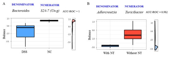 Microbial signatures with predictive accuracy for the colitis and NT supplementation status were identified using selbal. The signature or balance, consisting of Bacteroides (denominator) and an unclassified genus (Un.g) in the family S24-7 (numerator), had an area under the receiver operating characteristic curve (AUC) of 1.00 for the DSS-induced colitis condition (mean cross validation or CV-AUC = 1.00), as shown in Figure 5A. The balance value was negative for the colitis phenotype, indicating that the relative abundance of the denominator, Bacteroides, was much higher than the nominator. Moreover, the signature represented by the log ratio of the abundance of Adlercreutzia (denominator) and Turicibacter (numerator) can robustly predict the NT supplementation status (CV-AUC = 0.79). The negative balance values for the NT group resulted from the significant decrease in the abundance of Turicibacter due to NT ingestion, as shown in Figure 5B.