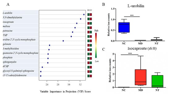 Urobilin related pathways dysregulated in a colitis murine model induced by dextran sulfate sodium. (A) Partial least squares discriminant analysis (PLS-DA) identified L-urobilin, N, N-dimethylalanine and isocaproate as the top three important metabolites that were discriminative of the colitis phenotype. (B) Gut luminal L-urobilin concentrations were significantly reduced by DSS. (C) Isocaproate levels were significantly higher in colitis mice. NC: normal controls; MD: colitis induced by DSS; NT: DSS induced colitis mice supplemented with NT. *** p < 0.001.