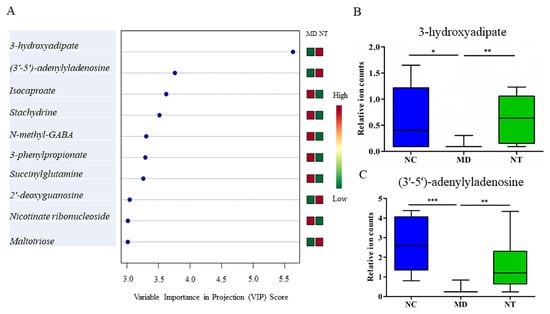 Important metabolites related to neoagarotetraose (NT) supplementation. (A) Metabolite predictors discriminative of NT supplementation status based on variable importance in projection scores. (B) NT supplementation significantly reversed the 3-hydroxyadipate concentrations from a repressed level in DSS induced colitis mice. (C) NT supplementation restored the (3’–5’)-adenylyladenosine repressed by DSS to the basal level observed in normal controls. NC: normal controls; MD: colitis induced by DSS; NT: DSS-induced colitis mice supplemented with NT. * p < 0.05; ** p < 0.01; *** p < 0.001.