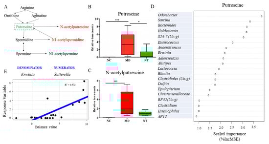 Microbial signatures correlated with gut luminal putrescine levels. (A) A diagram showing the arginine metabolism pathway. (B) The levels of putrescine and N-acetylputrescine (C) significantly impacted by neoagarotetraose (NT). (D) Microbial genera that were correlated with gut putrescine concentrations identified using a Random Forest regression model. E: A global balance or microbial signature strongly correlated with gut putrescine concentrations. NC: normal controls; MD: colitis induced by DSS; NT: DSS induced colitis mice supplemented with NT. %IncMSE: Percentage increase in mean squared error. * p < 0.05; *** p < 0.001.