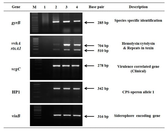 All biochemically suspect isolates of V. vulnificus were positive for gyrB (species-specific marker) confirming the isolates as V. vulnificus []. Further, all the isolates possessed virulence-associated genes coding for the protein hemolysin/cytolysin (VvhA), MARTX and siderophore gene (viuB) (Figure 1).